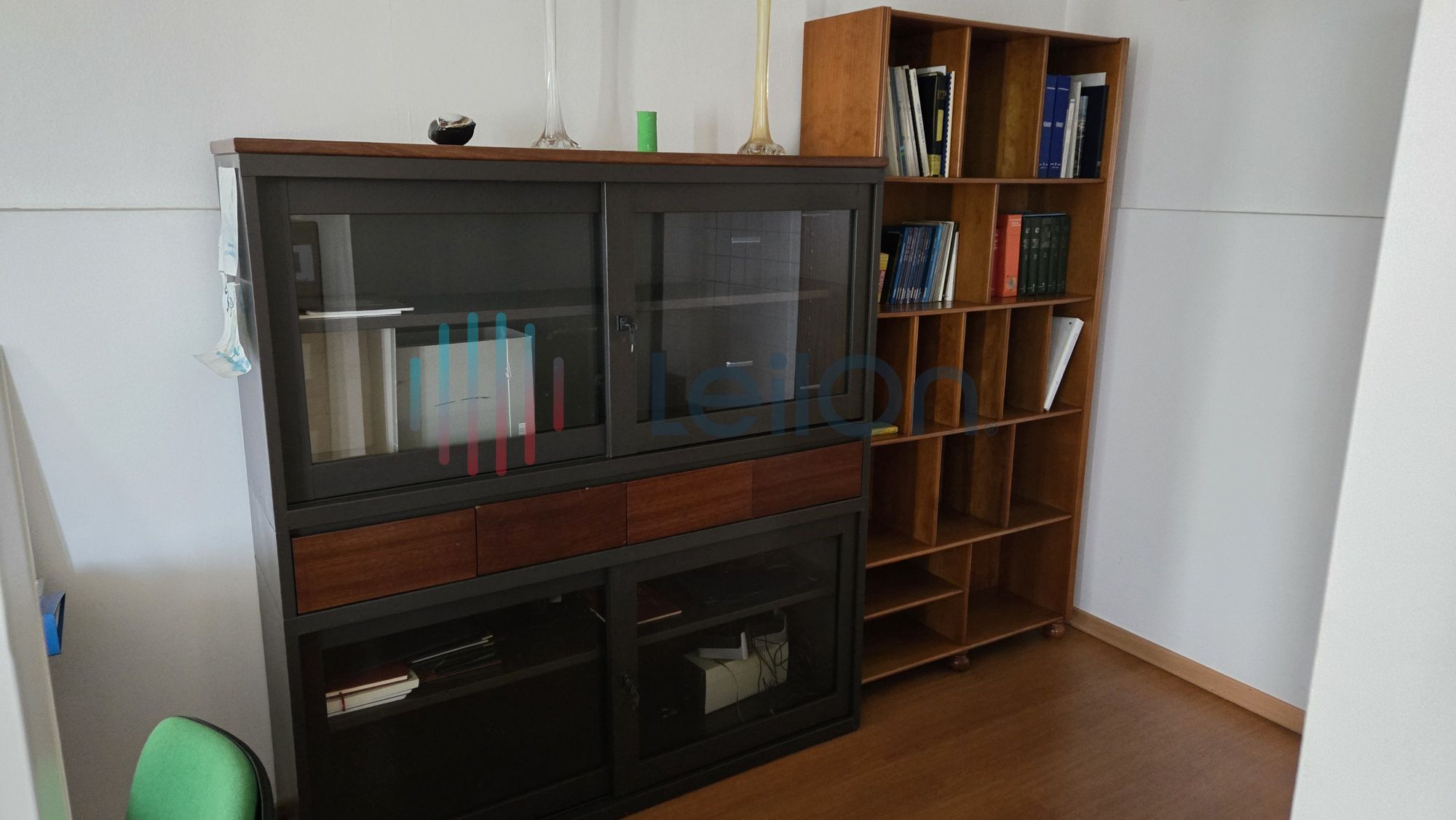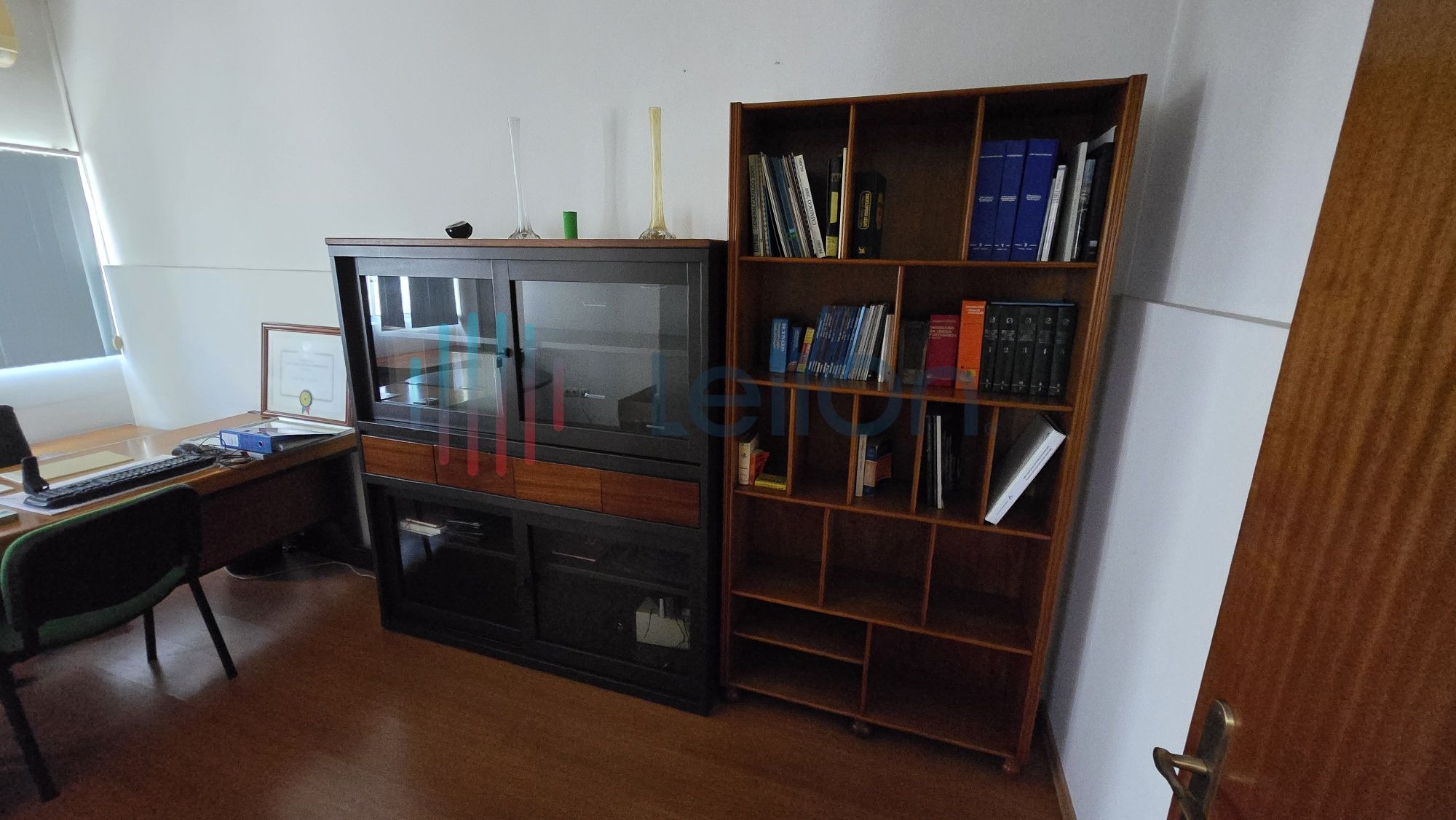 1 secretária; 1 mesa; 2 cadeiras, 1 armário de 3 portas; 2 estantes com porta de correr, 1 armário.