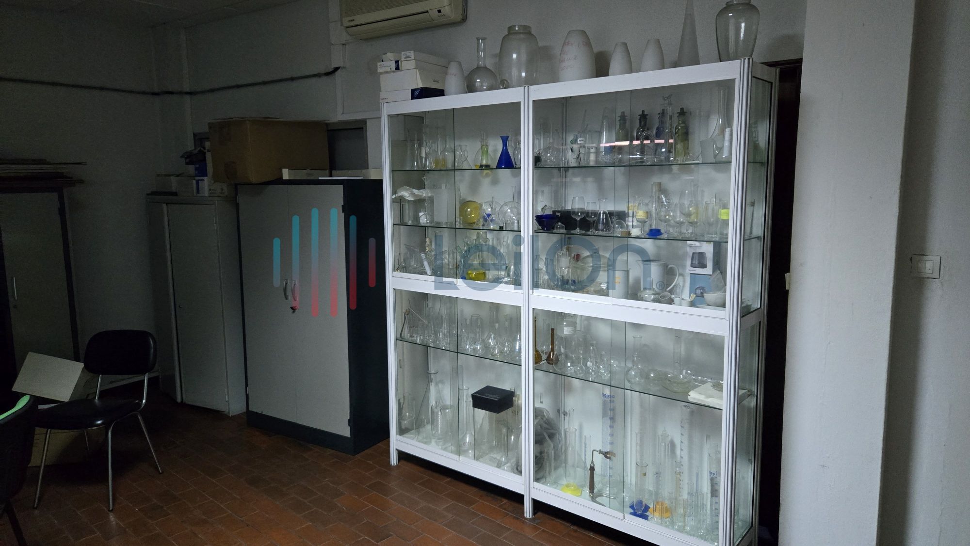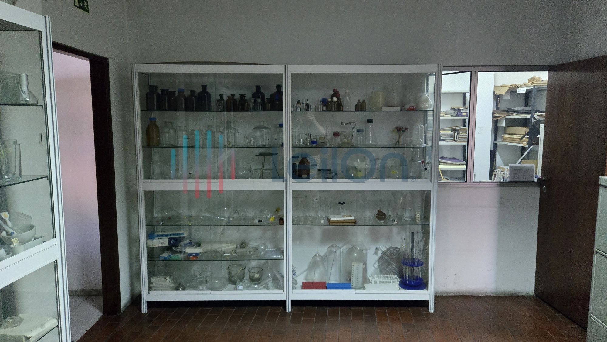 2 armários expositores com portas em vidro; 3 armários de 2 portas; 1 cofre; 1 móvel de arquivo de 4 gavetas; 1 mesa-redonda; 3 cadeiras; diversas amostras de material de laboratório; 1 estante.