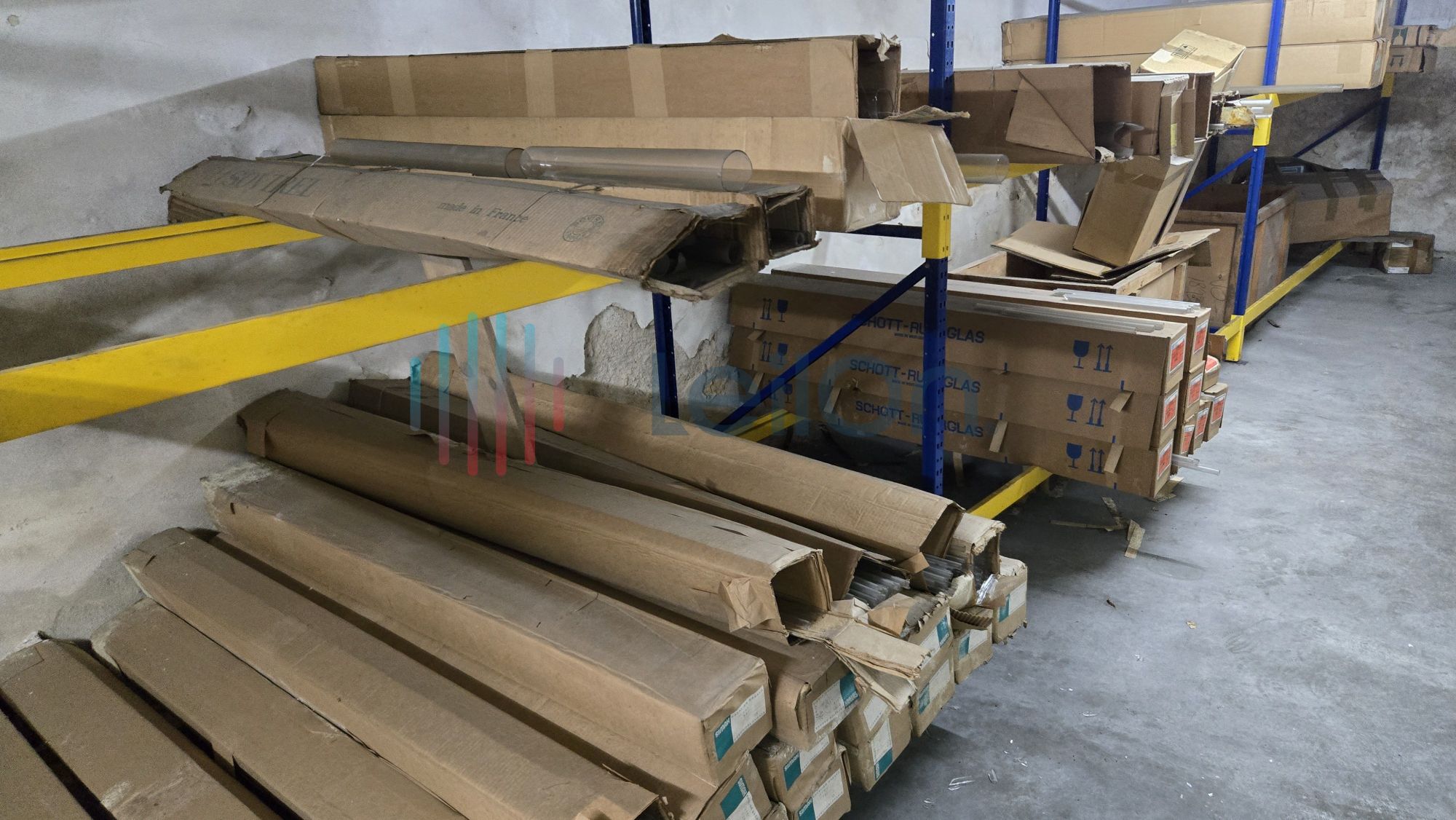 Cerca de 13 mts de estantes; 1 lote de tubos de diversos diâmetros, 1 lote de cartão; 1 aspirador; 4 estantes em DEXIA.