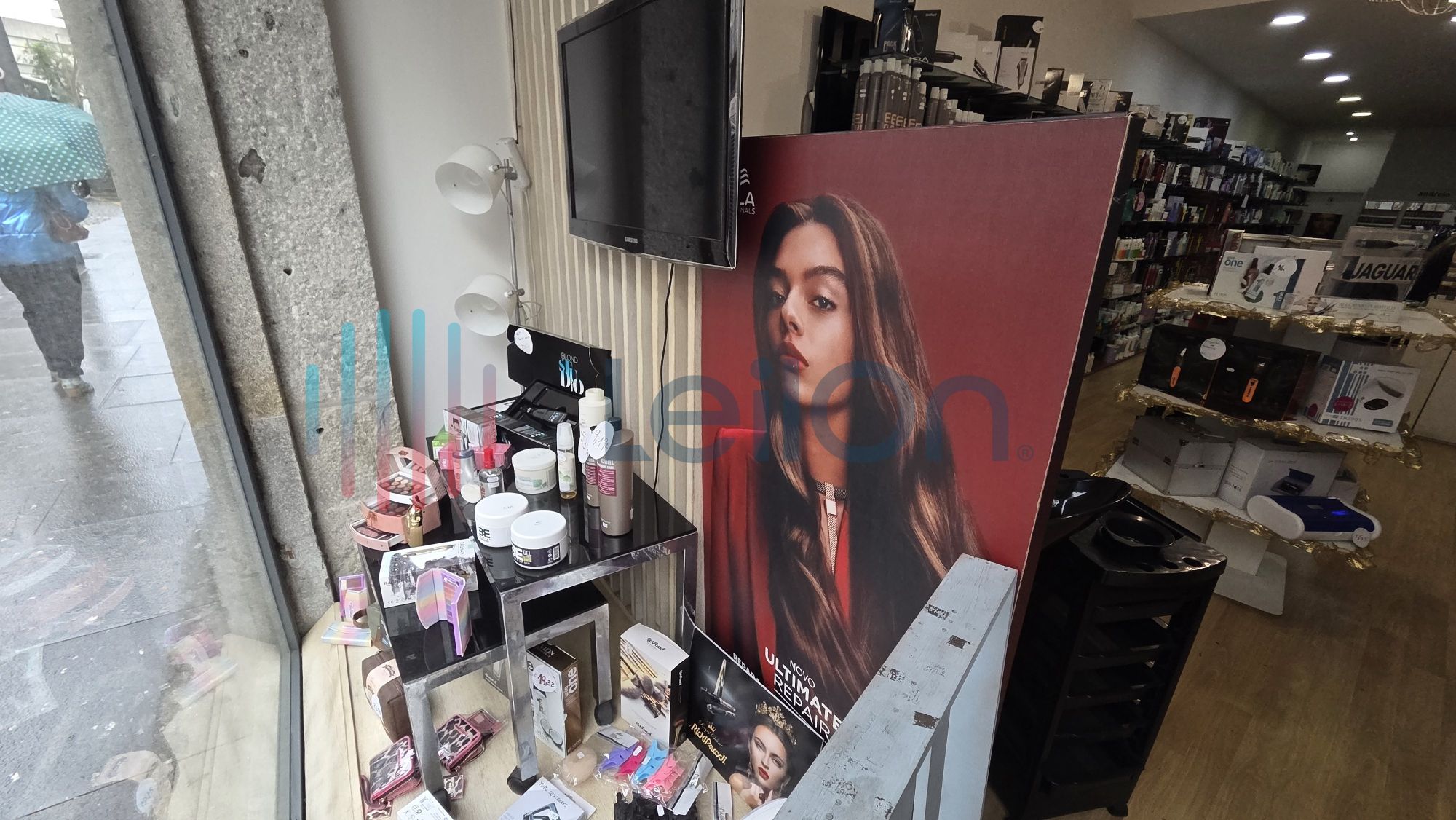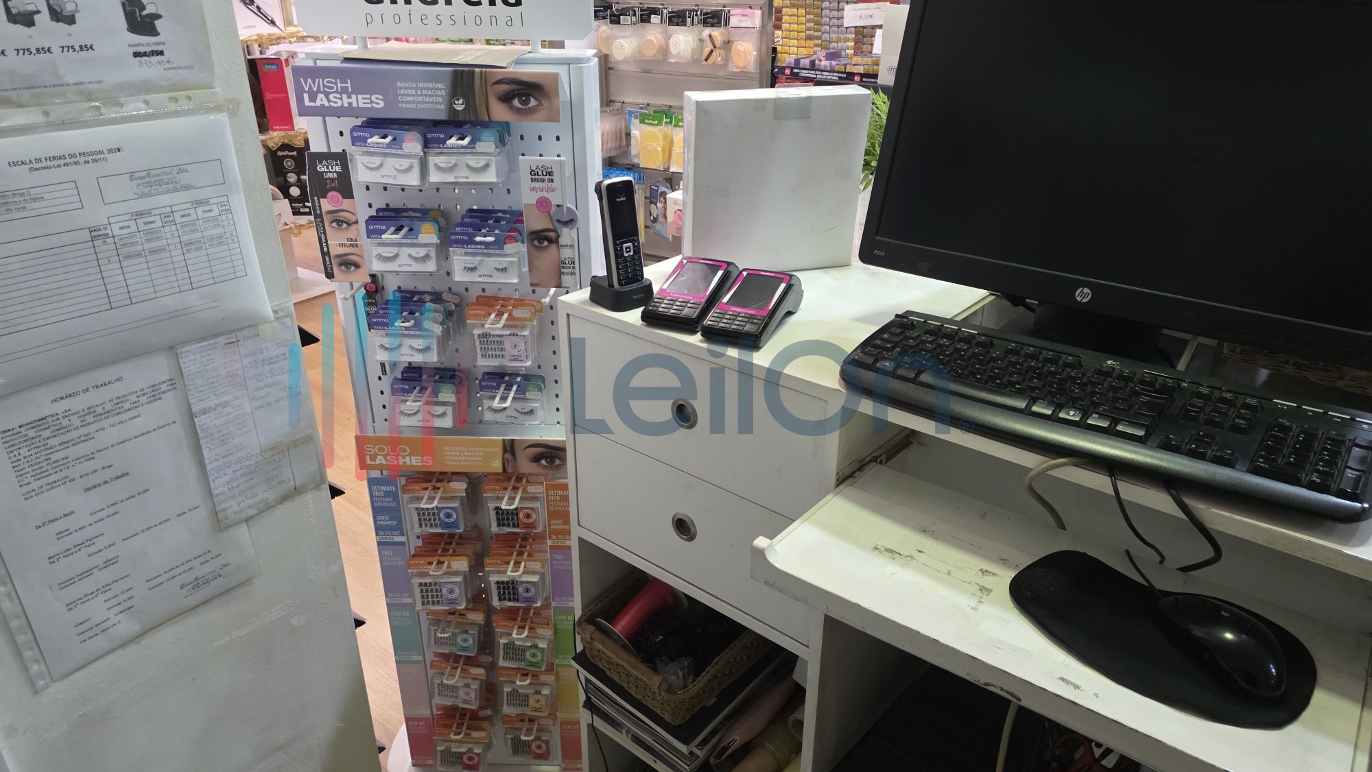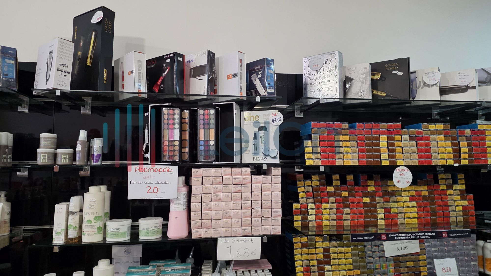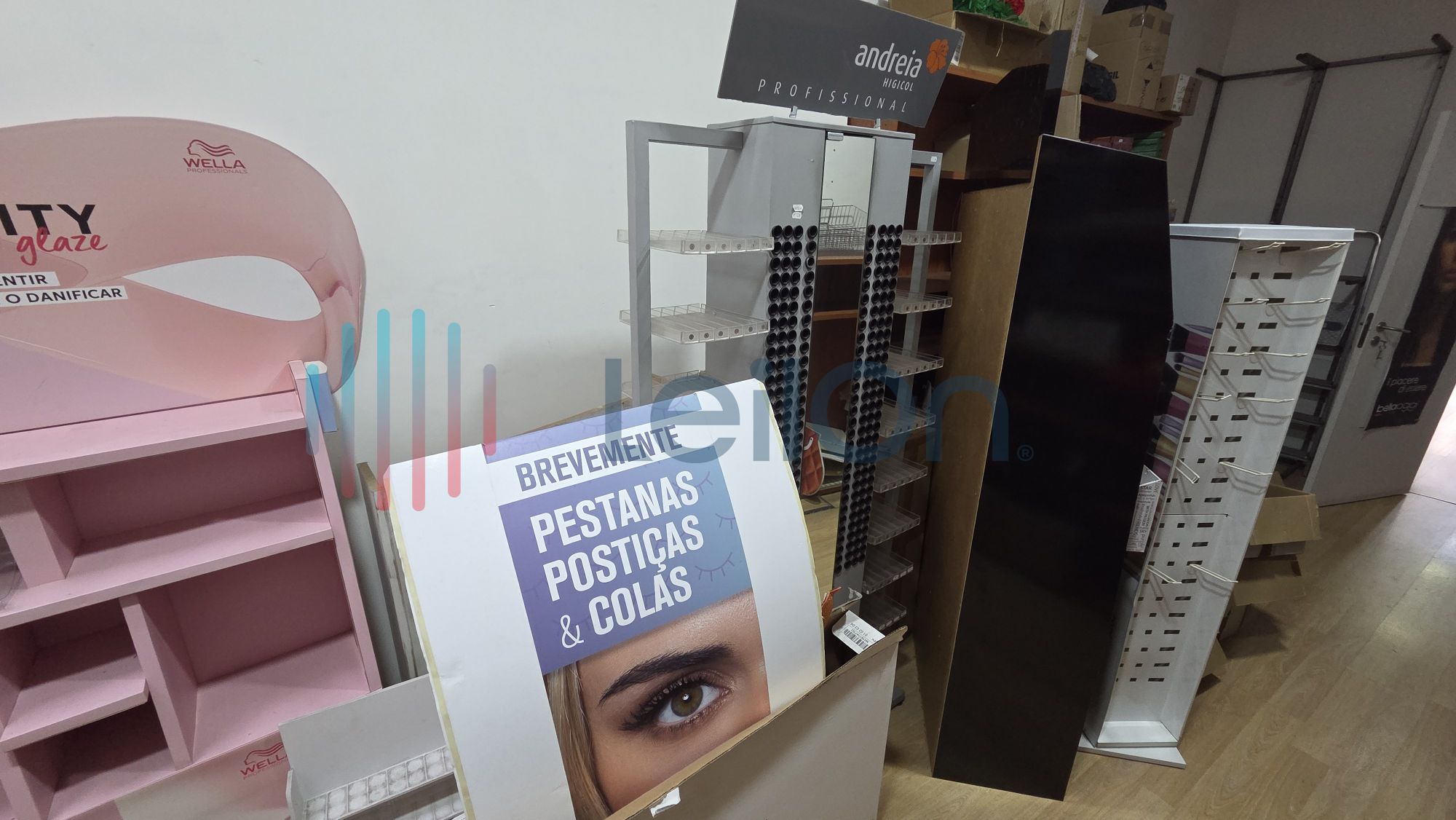 1 LCD da marca Samsung e 2 mesas expositoras, máscaras faciais, 1 computador com monitor, teclado e rato da marca HP, 1 caixa registadora, 15 prateleiras expositoras de parede com vidro, 2 prateleiras com 8 divisórias, 2 expositores, 2 prateleiras brancas de 6 divisórias e 5 prateleiras de madeira no armazém, 1 escadote.
