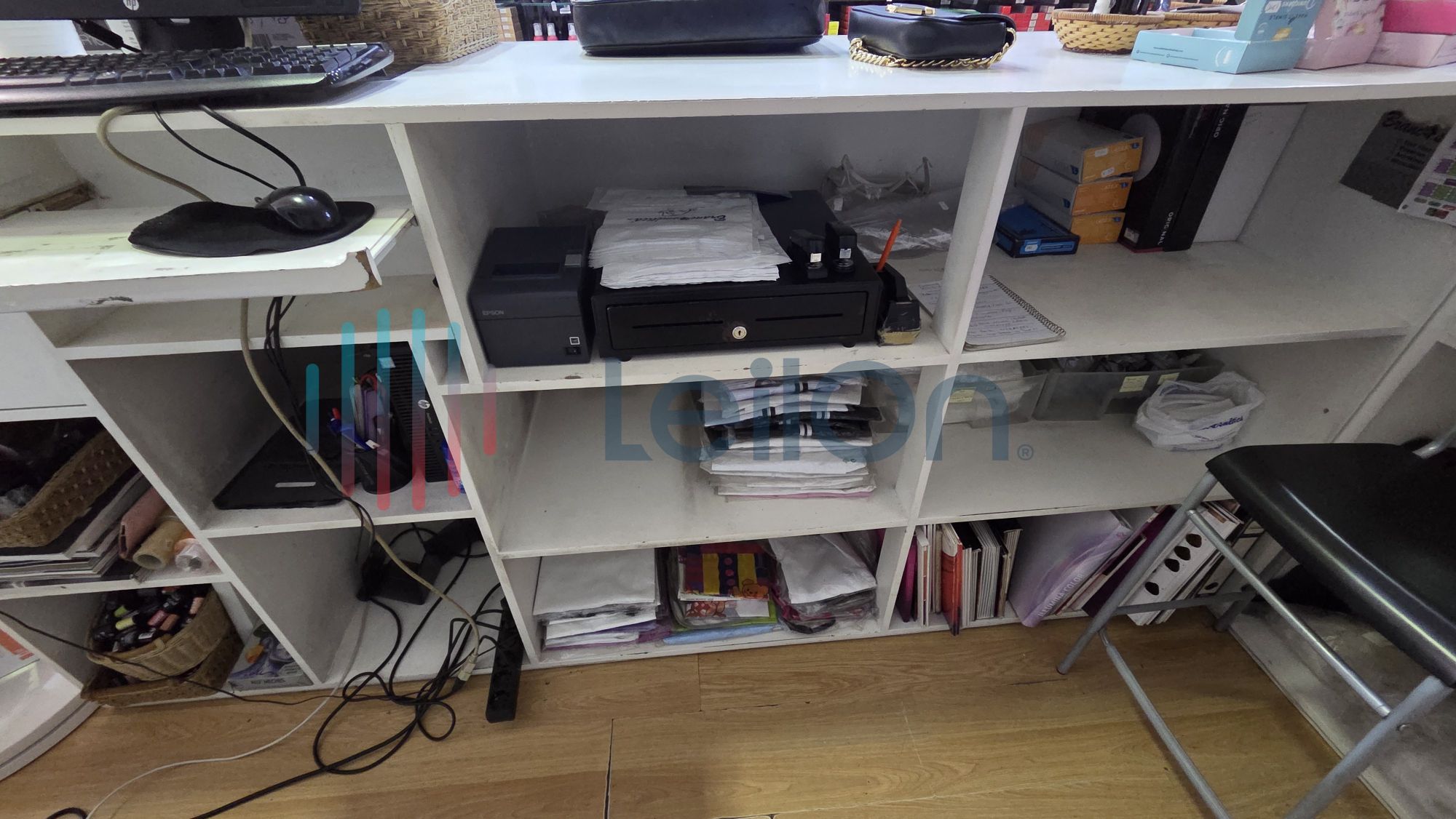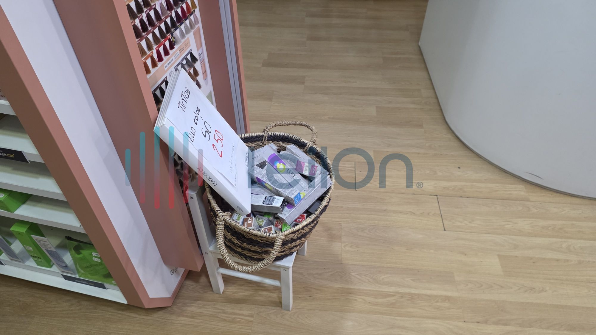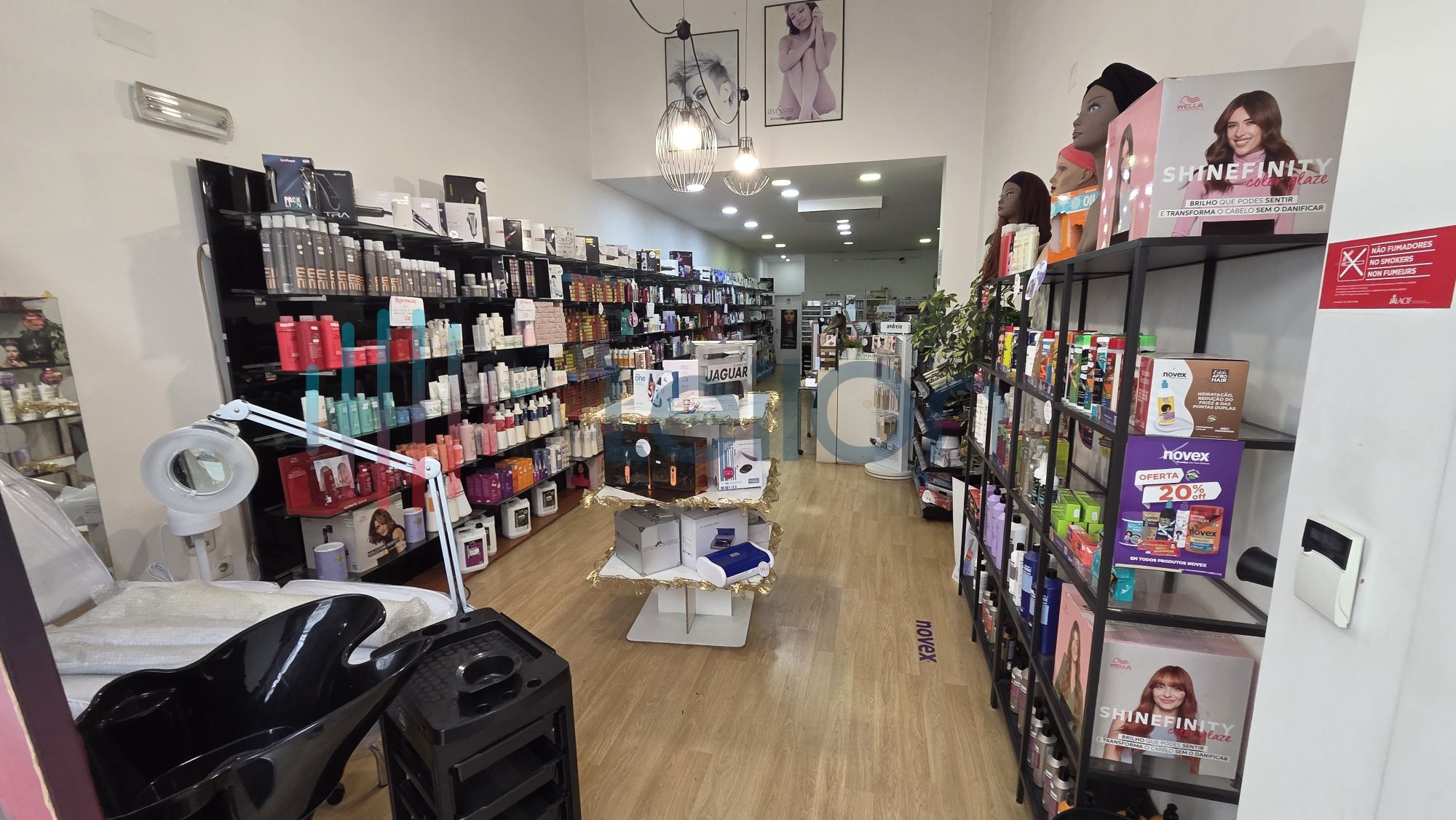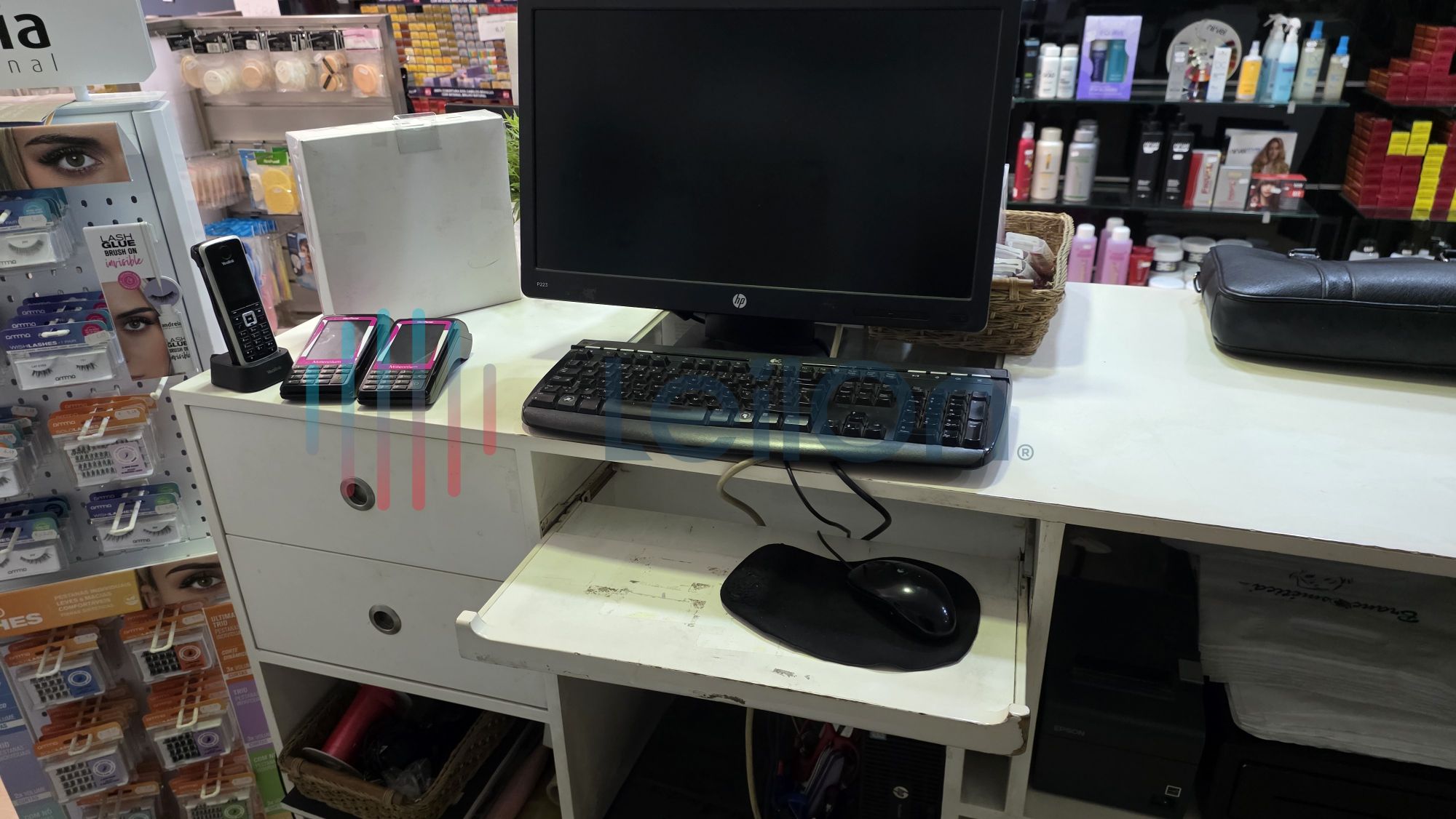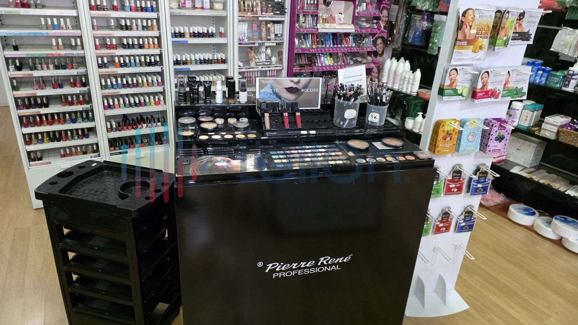 1 LCD da marca Samsung e 2 mesas expositoras, máscaras faciais, 1 computador com monitor, teclado e rato da marca HP, 1 caixa registadora, 15 prateleiras expositoras de parede com vidro, 2 prateleiras com 8 divisórias, 2 expositores, 2 prateleiras brancas de 6 divisórias e 5 prateleiras de madeira no armazém, 1 escadote.