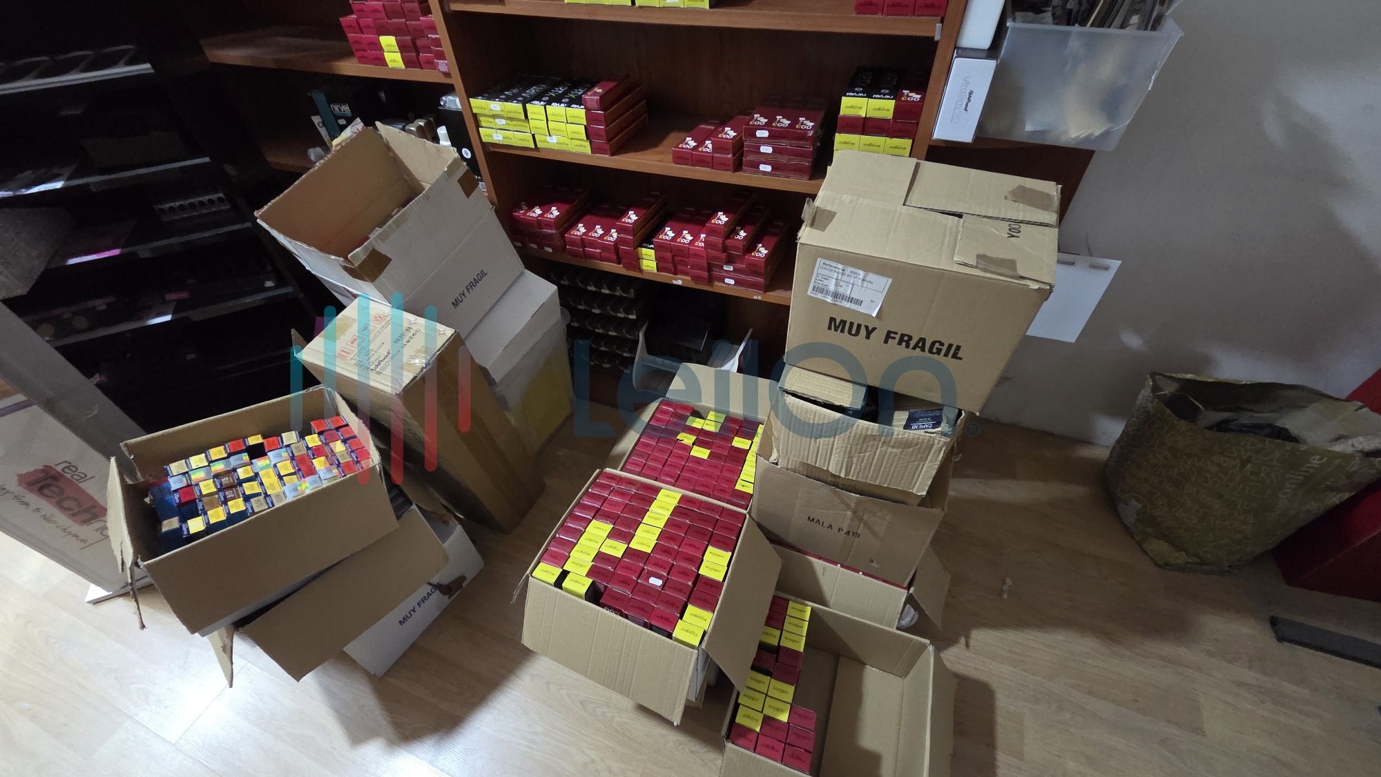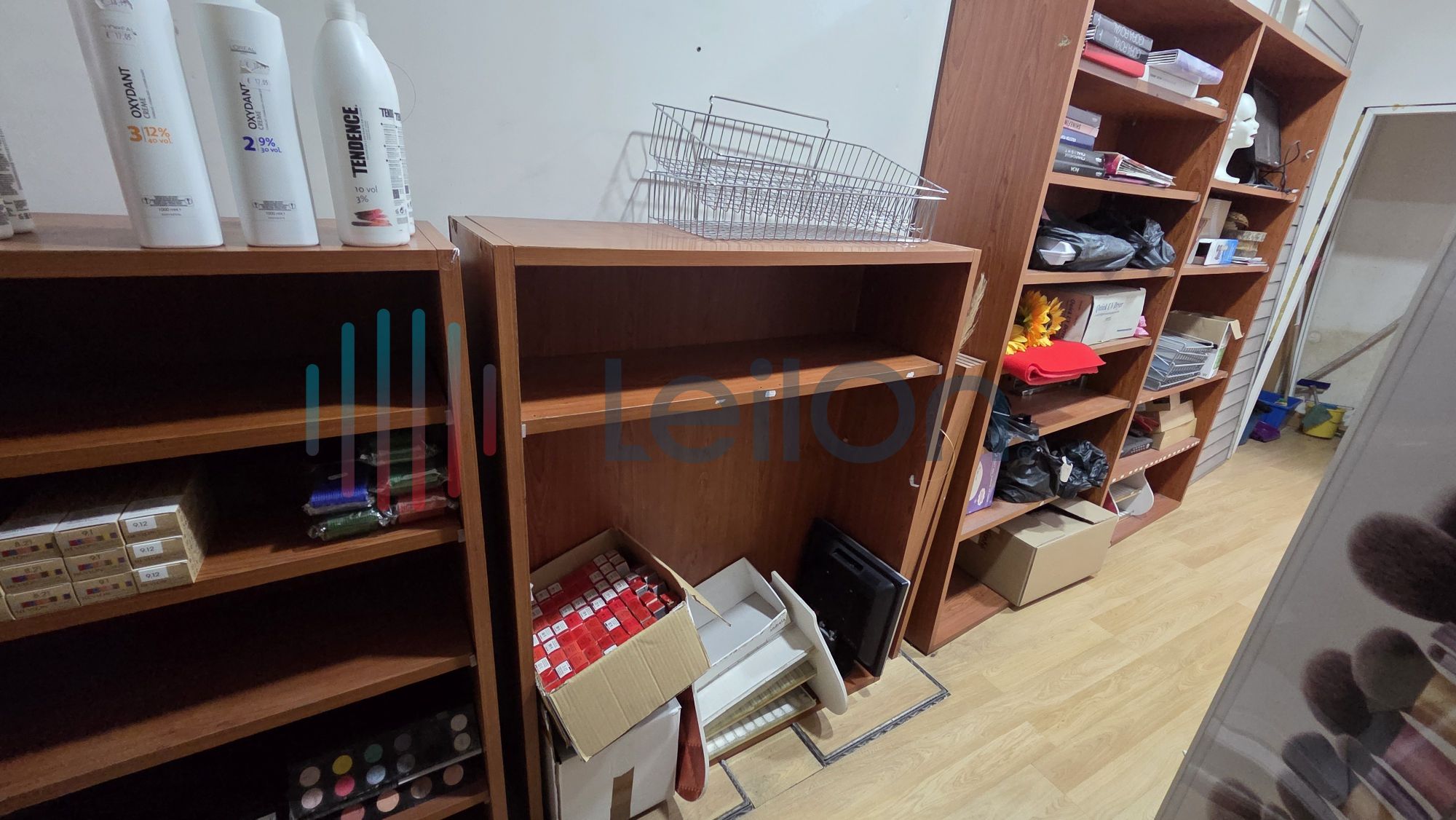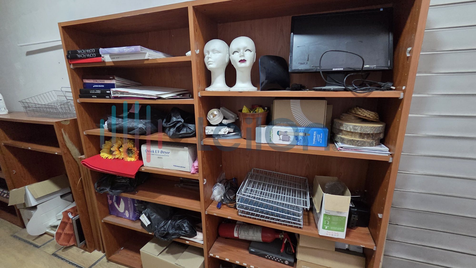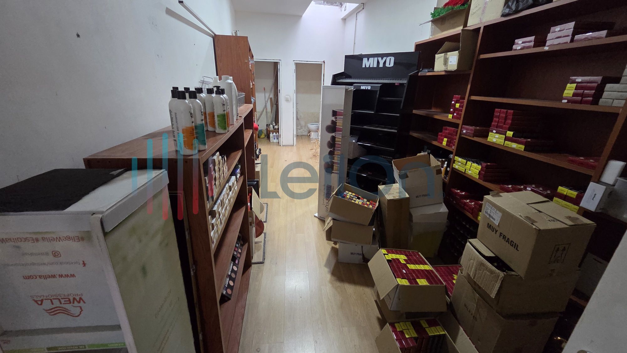 1 LCD da marca Samsung e 2 mesas expositoras, máscaras faciais, 1 computador com monitor, teclado e rato da marca HP, 1 caixa registadora, 15 prateleiras expositoras de parede com vidro, 2 prateleiras com 8 divisórias, 2 expositores, 2 prateleiras brancas de 6 divisórias e 5 prateleiras de madeira no armazém, 1 escadote.