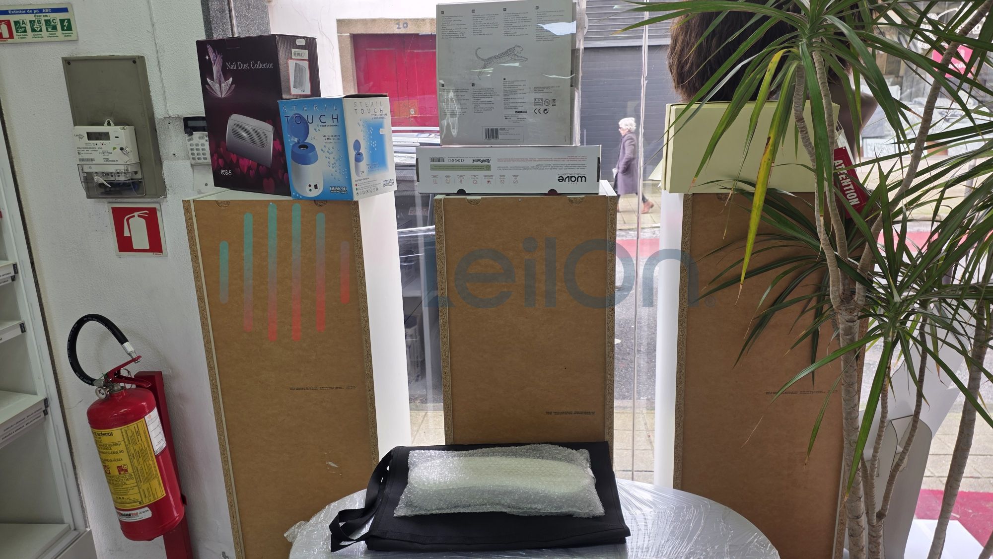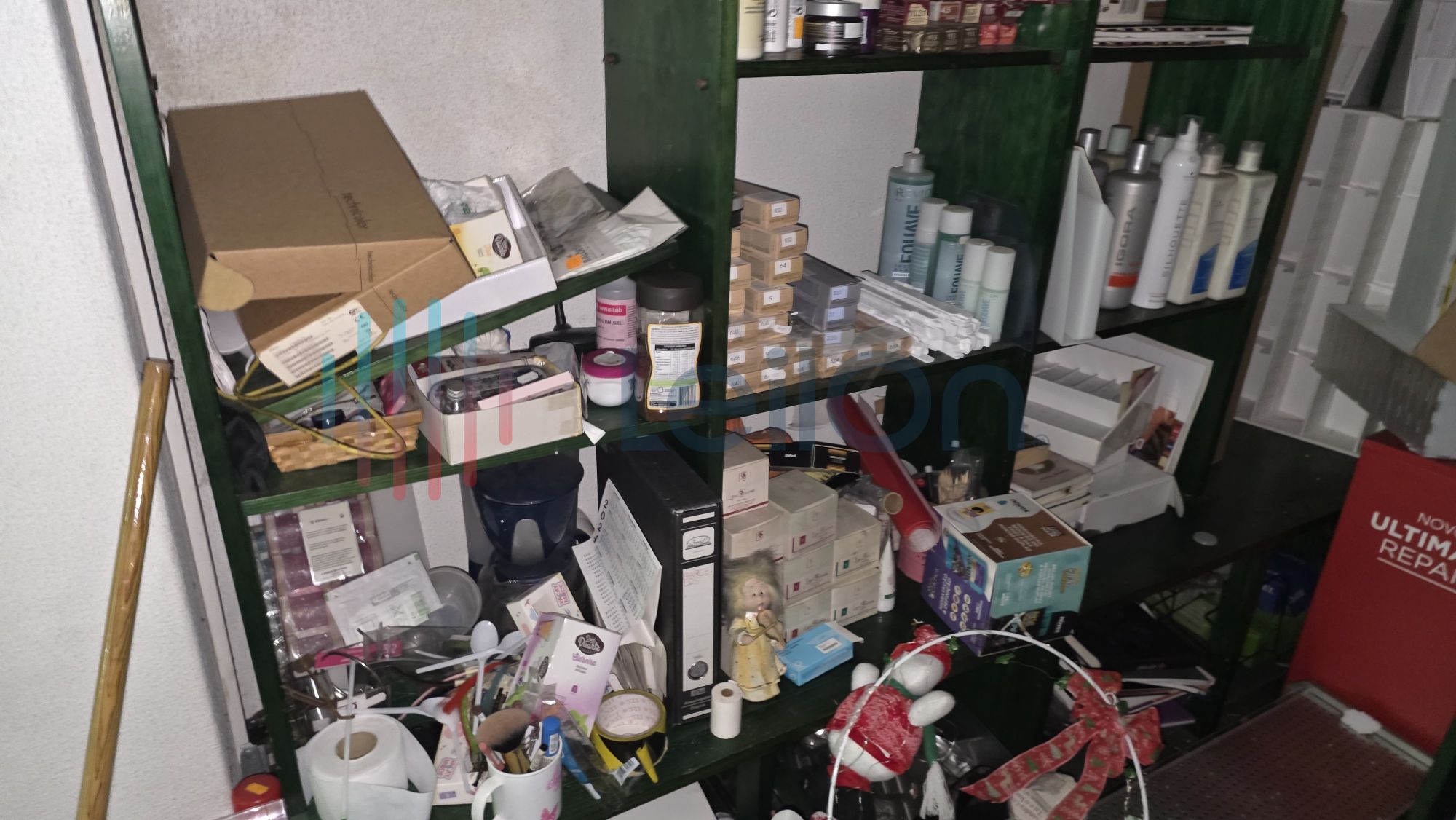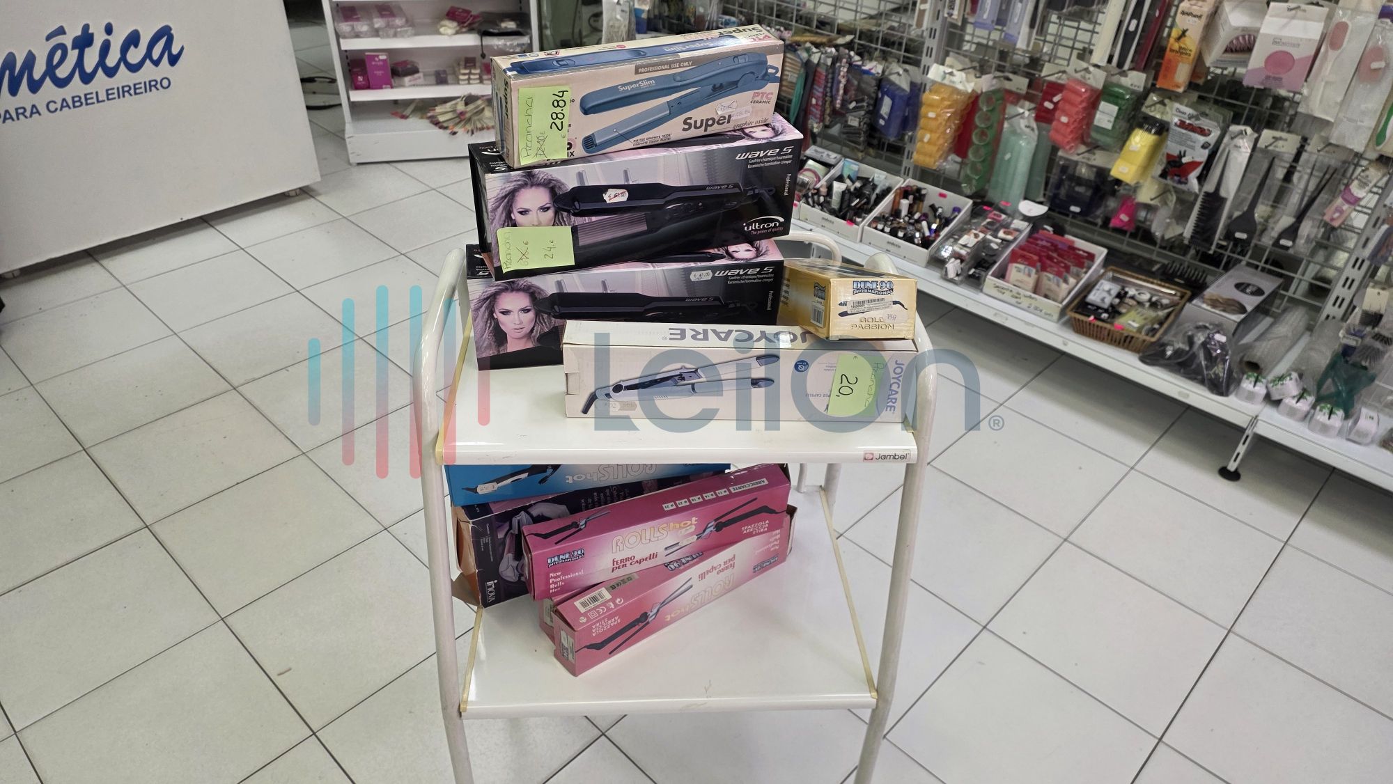 ✓ Produtos profissionais para cabeleireiros e esteticistas, incluindo ferramentas e mobiliário, tais como 2 carrinhos plásticos, 1 carrinho expositor, 2 aquecedores roll-on, cerca de 20 modeladores/ pranchas, 1 secador, 1 aspirador de unhas, 2 difusores, 2 silenciadores da marca Parlux, 2 catalisadores, 1 lupa, 2 esterilizadores, cerca de 10 modeladores obsoletos, 1 mesa de unhas com rodas, 1 aspirador de unhas, cerca de 13 máquinas de barbear/ cortar cabelo, 2 perucas, 4 depiladoras, 1 motor de broca.